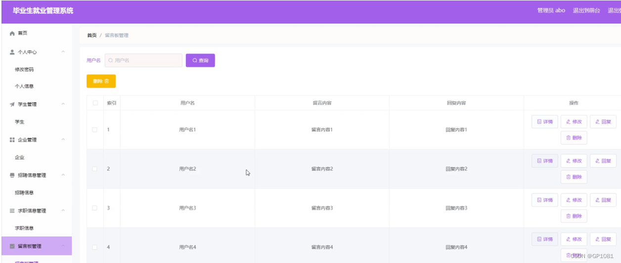 留言板管理,在留言板管理页面中可以对索引、用户名、留言内容、回复内容等信息进行详情,修改、回复或删除等操作,如图5-11所示。