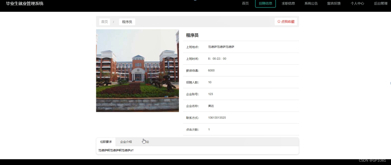 招聘信息,在招聘信息页面中可以查看岗位名称、图片、上班地点、上班时间、薪资待遇、招聘人数、企业账号、企业名称、联系方式、任职要求、企业介绍等信息进行评论或收藏;如图5-2所示。