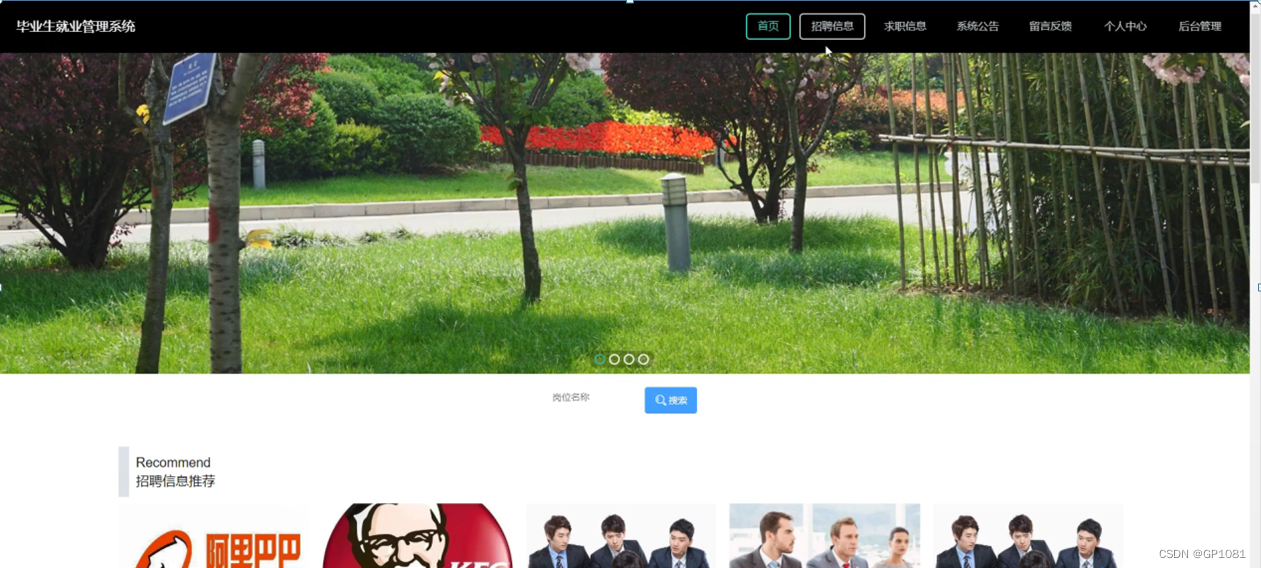 毕业生就业管理系统,在系统的首页可以查看首页、招聘信息、求职信息、系统公告、留言反馈、个人中心、后台管理等信息进行相应操作,如图5-1所示。