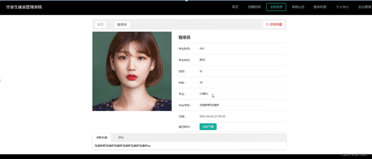 求职信息,在求职信息页面中可以查看期待岗位、学生账号、学生姓名、性别、年龄、专业、头像、毕业学校、简历附件、日期、求职内容等信息进行评论或收藏;如图5-3所示。