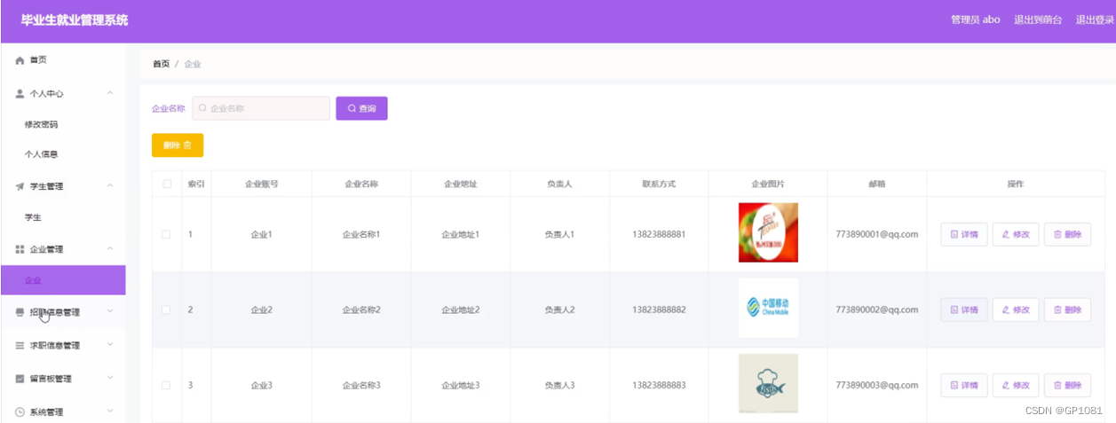 企业管理,在企业管理页面中可以对索引、企业账号、企业名称、企业地址、负责人、联系方式、企业图片、邮箱等信息进行详情,修改或删除等操作,如图5-8所示。