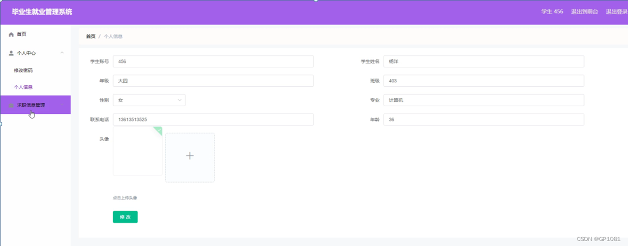 个人中心,在个人中心页面中通过填写学生账号、学生姓名、年级、班级、性别、专业、联系电话、年龄、头像等信息进行个人信息修改,如图5-13所示。