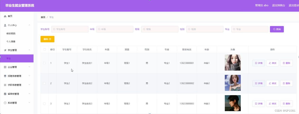学生管理,在学生管理页面中可以对索引、学生账号、学生姓名、年级、班级、性别、专业、联系电话、年龄、头像等信息进行详情,修改或删除等操作,如图5-7所示。