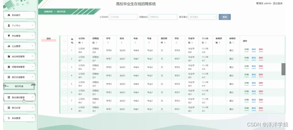 此外,高校毕业生在线招聘系统还可以为学校和教育部门提供就业数据和分析报告。通过对毕业生就业情况的统计和分析,系统可以为学校和教育部门提供有关就业趋势和就业率的数据,帮助他们更好地了解就业形势,优化人才培养方案。