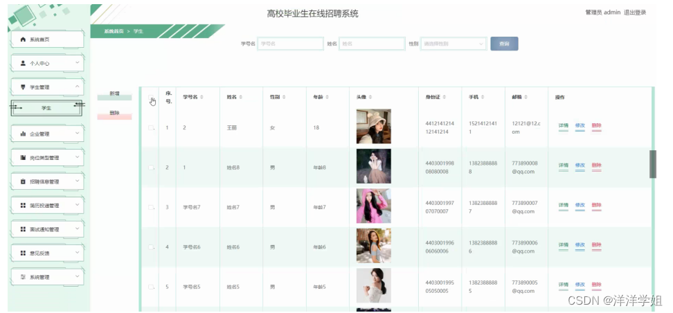 管理员点击学生管理,在学生管理页面输入学号名、姓名、性别、年龄、头像、身份证、手机、邮箱等信息,然后进行查询、新增或删除学生信息等操作,如图5-9所示。