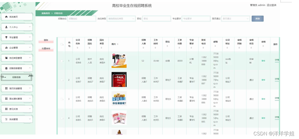 管理员点击招聘信息管理,在招聘信息管理页面输入公司名称、招聘岗位、岗位类型、图片、招聘人数、工作时间、职位、工资待遇、专业要求、联系电话、邮箱、公司地址、审核回复、审核状态、审核等信息,然后进行查询或删除招聘信息等操作,如图5-11所示。