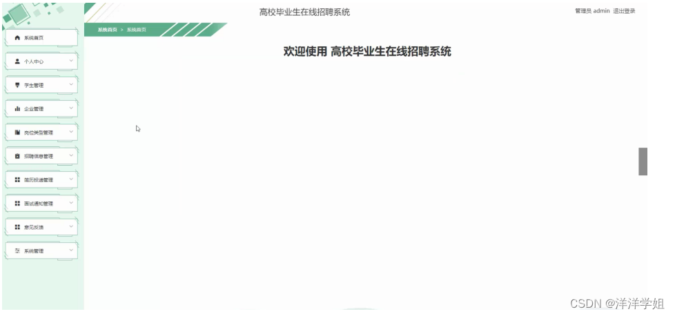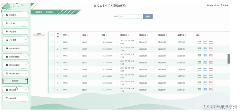 管理员登录系统后,可以对系统首页、个人中心、学生管理、企业管理、岗位类型管理、招聘信息管理、简历投递管理、面试通知管理、意见反馈、系统管理等进行相应的操作管理,如图5-8所示。