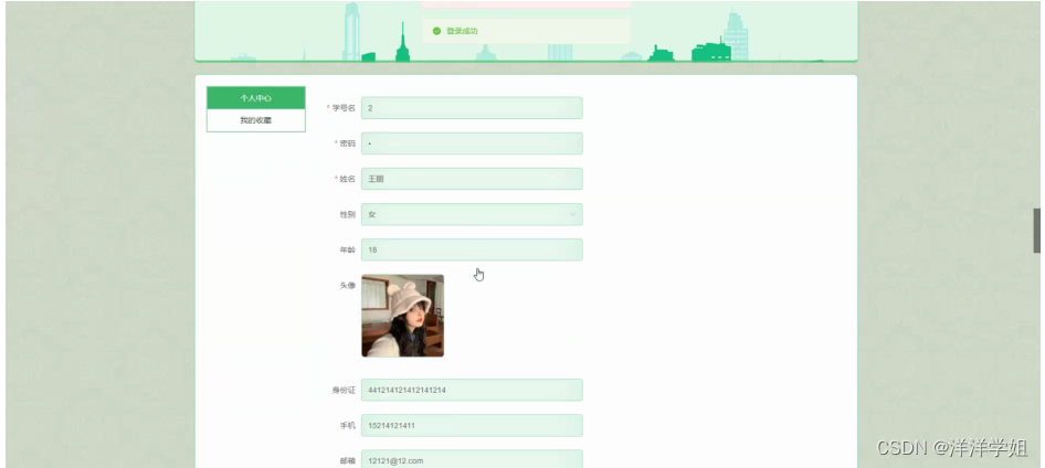 学生点击个人中心,在个人中心页面可以修改个人信息、密码修改,还可以对我的收藏进行操作,如图5-6所示。
