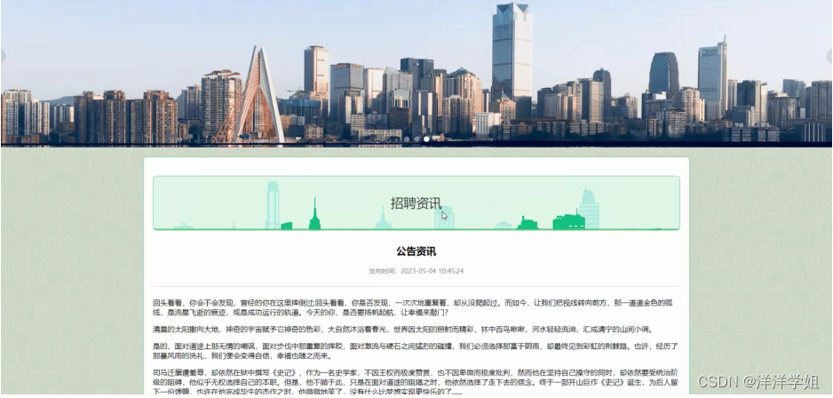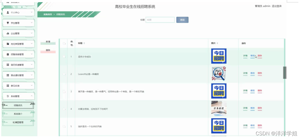 学生点击招聘资讯,在招聘资讯页面的输入栏填写标题可以进行查询,也可以查看标题、类型、发布时间、封面等内容;如图5-5所示。