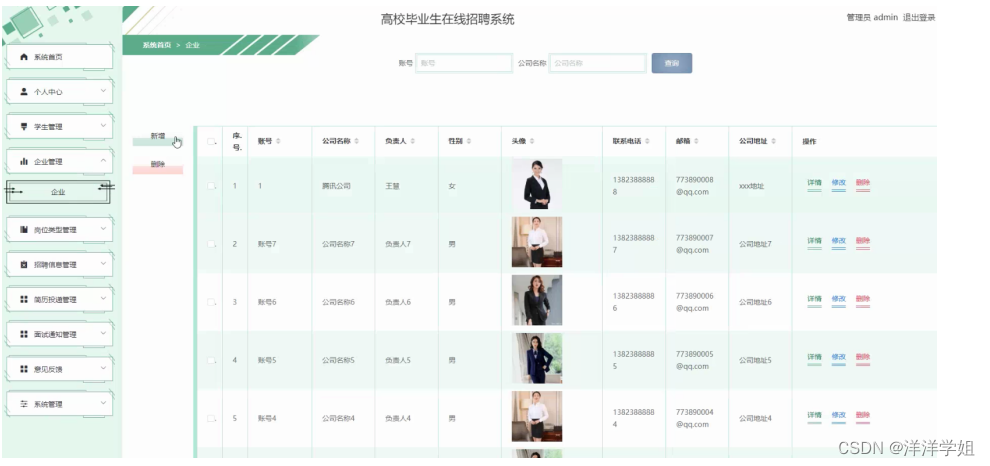 管理员点击企业管理,在企业管理页面输入账号、公司名称、负责人、性别、头像、联系电话、邮箱、公司地址等信息,然后进行查询、新增或删除企业等操作,如图5-10所示。