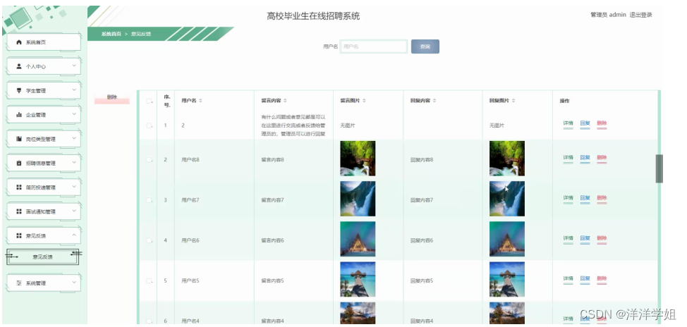管理员点击意见反馈,在意见反馈页面输入用户名、留言内容、留言图片、回复内容、回复图片等信息,然后进行查询或删除意见反馈等操作,如图5-14所示。
