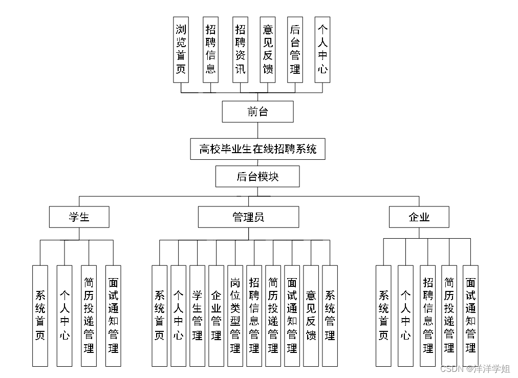 高校毕业生在线招聘系统的使用者主要有三类用户,一类是管理员,他拥有整个系统的最高权限,然后是学生和企业,他具有管理员给予级别的权限,都只能对自己的个人信息进行操作。系统根据这三类用户,划分出了三大功能模块。
