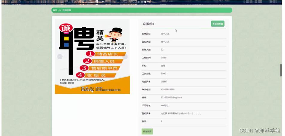 学生点击招聘信息,在招聘信息页面的输入栏填写招聘岗位、岗位类型、职位、专业要求可以进行查询查询,也可以查看公司名称、招聘岗位、岗位类型、图片、招聘人数、工作时间、职位、工资待遇、专业要求、联系电话、邮箱、公司地址等内容,并进行简历投递、收藏或者评论等操作;如图5-4所示。