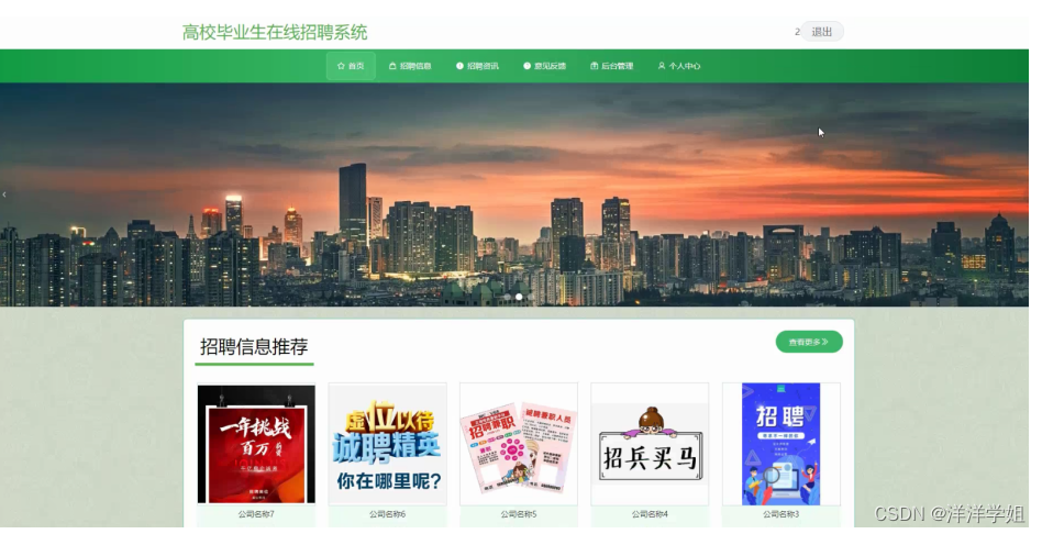 网站首页页面主要包括首页、招聘信息、招聘资讯、意见反馈、后台管理、个人中心等内容,并根据需要进行详细操作;如图5-1所示:
