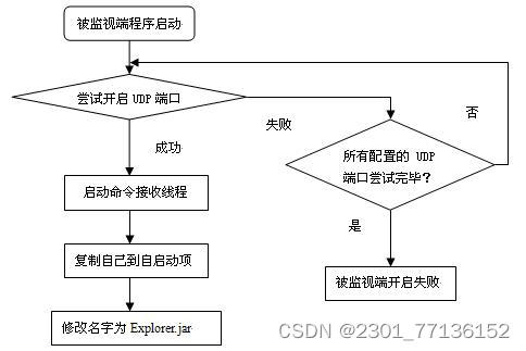 在被监控端安装客户端程序,程序启动的时候,尝试开启UDP端口,如果防火墙或者杀毒软件阻止,尝试开启配置的其它UDP端口,如果都尝试完毕,启动失败。否则,将开启的UDP套接字传入,然后开启命令接收线程,目的是进行命令获取,并对获取的命令进行处理。然后将自己复制到自启动项,并改名为Explorer.jar. 流程如图。