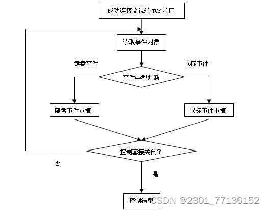 被监控端收到主控端的UDP命令:control:TCP Port,获得主控端开放的TCP端口号。成功连接主控端的TCP端口后,并从中读取事件对象,接着对事件对象进行类型判断,如果是键盘事件,就对键盘事件重演;如果是鼠标事件,就对鼠标事件重演。接着判定控制套接是否关闭,如果关闭,控制结束。否则返回继续读取事件。