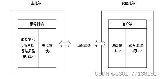 图把软件功能分解到通信的两个端点上,即客户端和服务器端,采用Client/Server模式。这样能提高设计的灵活性,易于系统的扩展。被监控端接受主控端命令,并处理命令,然后输出命令处理结果;主控端则提供交互界面及命令处理结果显示;数据交换通道的建立由双方的数据通信模块负责。从而实现点到点的直接控制监控,满足实时性要求。