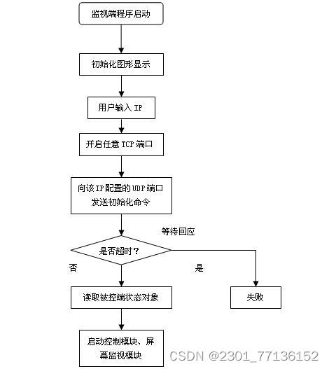在主控端安装服务器程序,主控端首先启动其控制窗口类,初始化图形在主控端安装服务器程序,主控端首先启动其控制窗口类,初始化图形显示,然后用户输入被监控端的IP地址。接着主控端开启任意TCP端口,并向该IP配置的UDP端口发送初始化命令(命令格式为ordername:port),ordername为命令名字,port为主控端打开的TCP端口号。主控端对开启的TCP端口进行监听,如果超时,连接失败。否则,主控端读取被监控端的状态对象,接着启动控制模块和屏幕监视模块。流程如图。
