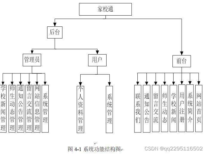 管理员退出:管理员用来退出后台系统。随着网络技术的飞速发展,网络已渗透到全人类的各个方面,深刻影响着我们的生活和工作方式。家校通网站给教育带来了更广阔的发展空间。家校通网站有对部分类似网站进行分析,找到规律和方法,吸取其特点,构思自己想要设计的网站,收集资料信息和查阅书籍等规划出网站的基本结构,根据需求分析设计好所需的功能模块,选择适当的开发工具及开发环境,画出逻辑分析图和实体关系图,选择适当的数据库进行预构建,思考实际操作过程中可能遇到的问题,提前思考解决方法,以便实施过程中能顺利解决所遇到的问题。