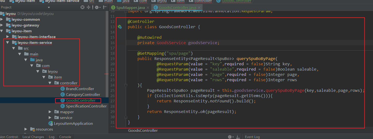public class GoodsController {@Autowiredprivate GoodsService goodsService;@GetMapping("spu/page")public ResponseEntity> querySpuBoByPage(@RequestParam(value = "key",required = false)String key,@RequestParam(value = "saleable",required = false)Boolean saleable,@RequestParam(value = "page",required = false)Integer page,@RequestParam(value = "rows",required = false)Integer rows){PageResult pageResult = this.goodsService.querySpuBoByPage(key,saleable,page,rows);if (CollectionUtils.isEmpty(pageResult.getItems())){return ResponseEntity.notFound().build();}return ResponseEntity.ok(pageResult);}