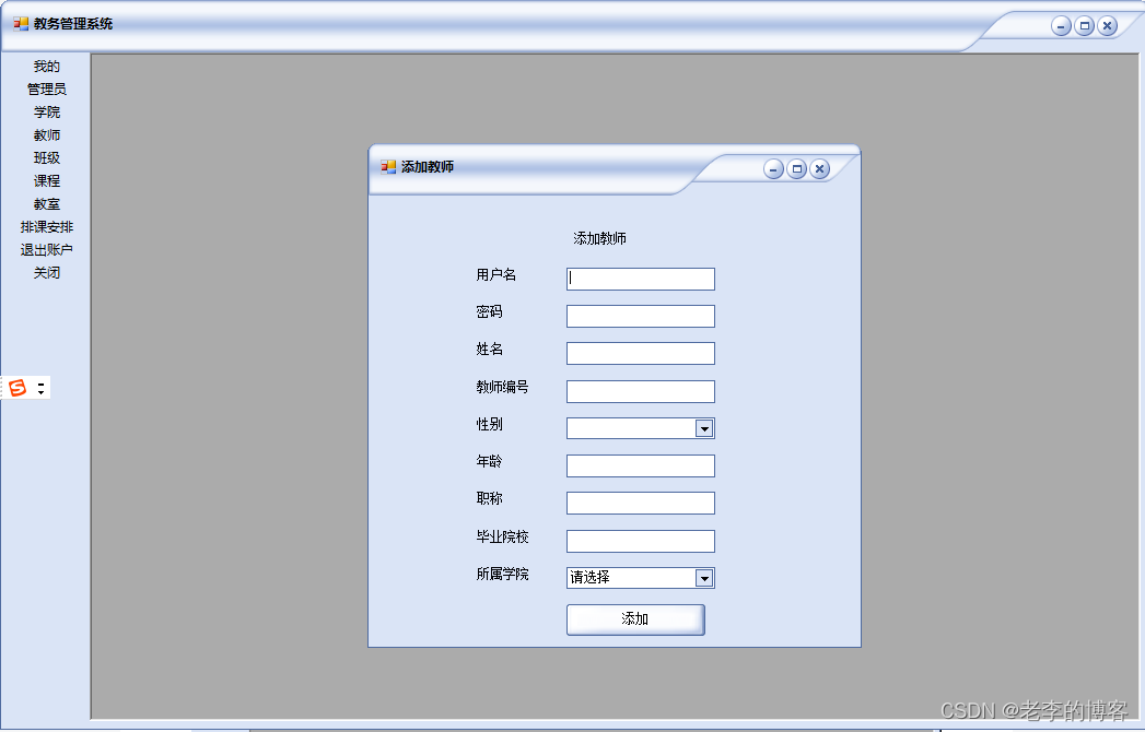 教师(主键,用户名,密码,姓名,教师编号,性别,年龄,职称,毕业院校,所属学院)