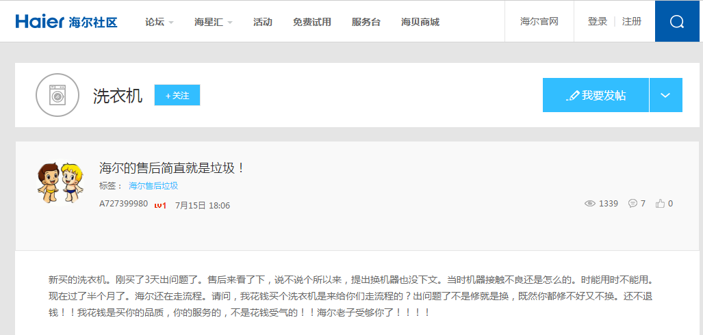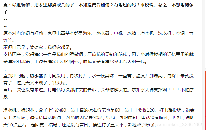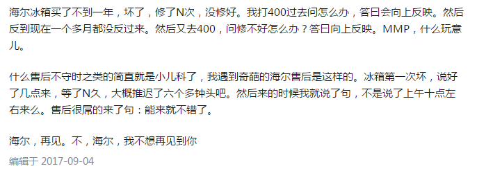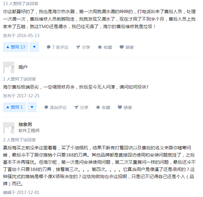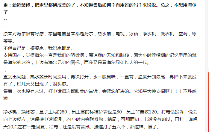 实在没办法了就想着上网查下电视什么原因吧,看看自己能不能修,有的网友说这种情况基本上是电容坏了,几十块的东西,保修期内的话不要钱,我家电视因为还没到一年所以在保修期,但没人管你又有什么用呢?结果在那篇帖子下面有好多人在骂海尔的服务,于是就跟帖看了下,又上百度贴吧和天涯知乎看了下,为了客观我甚至去海尔的售后官网看了下,很有意思等下给大家看,我们先来看看买过海尔产品的消费者对这个国货大牌是如何看待的吧