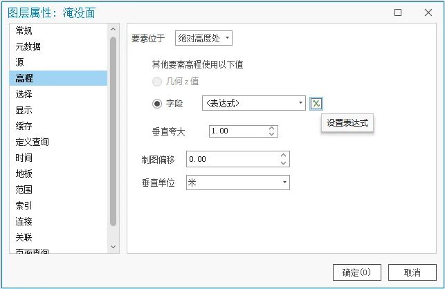 在模拟洪水面图层属性内,选择高程选项卡,设置要素位于绝对高度处,点击字段选项后面设置表达式按钮,如下图所示。