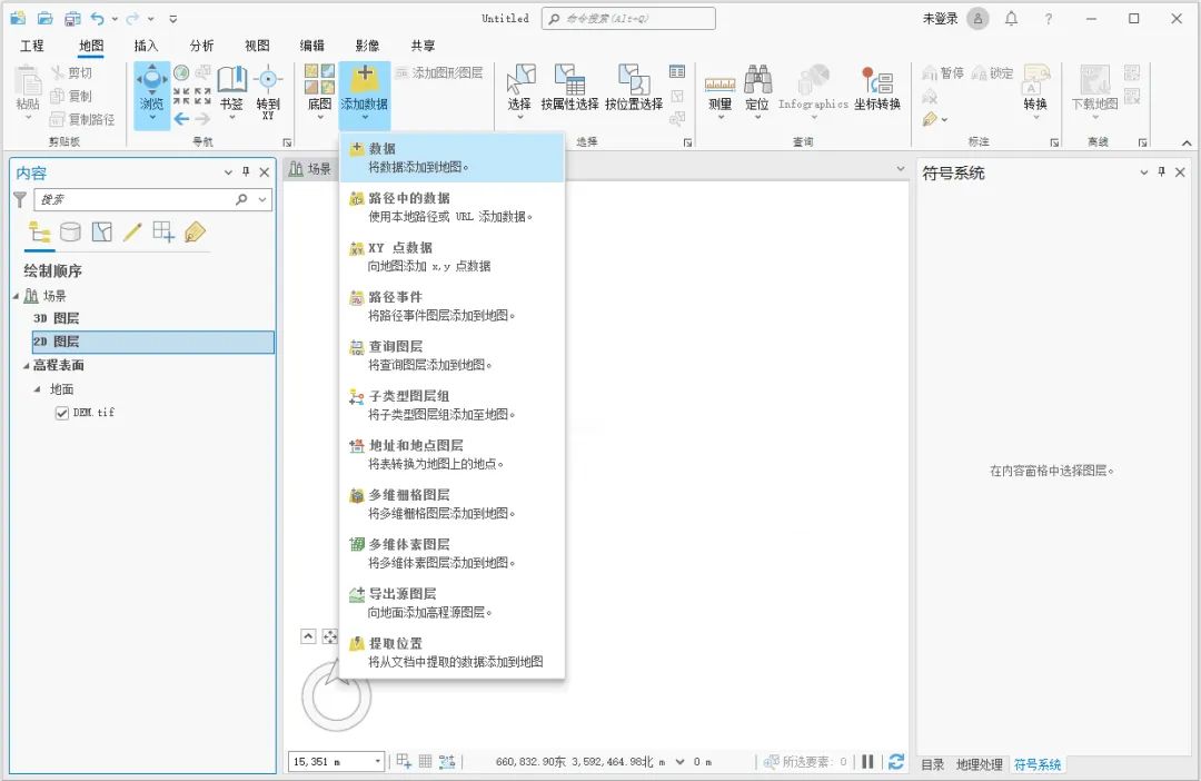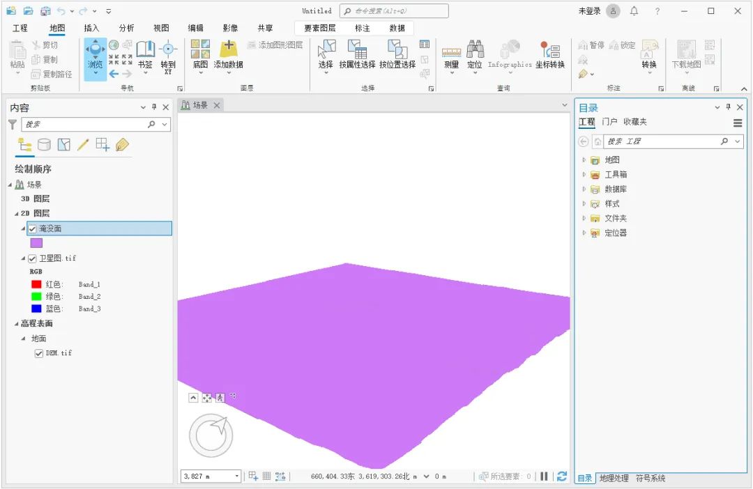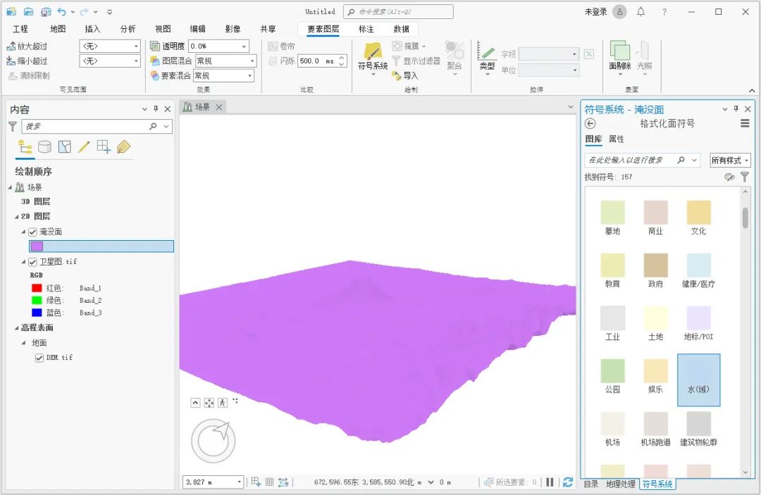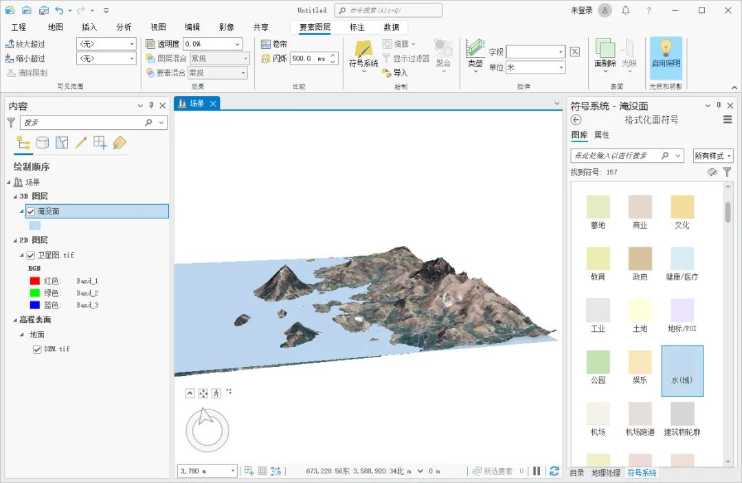 选中2D图层,点击添加数据,选择数据,将卫星地图和模拟淹没面的要素添加进来,如下图所示。