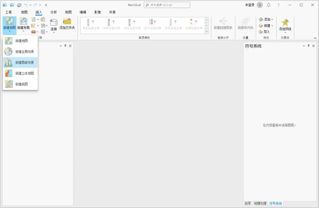 在菜单栏上点击插入,点击新建地图,选择新建局部场景,如下图所示。
