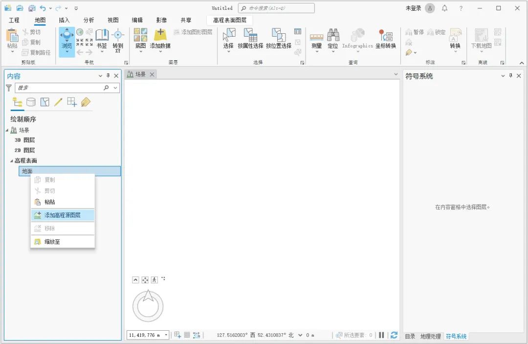 新建局部场景之后我们可以看到软件默认加载了全球的高程数据。如果你没有高程数据,可以使用软件自带的数据,如果有的话,可以将该资源移除,并点击右键,选择添加高程源图层,将自己的高程数据添加进来,如下图所示。
