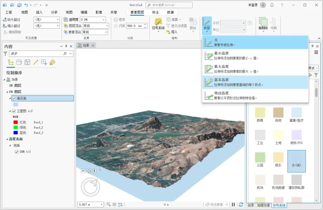 选中模拟淹没面图层,在菜单栏上点击要素图层,点击类型,选择基本高度,如下图所示。