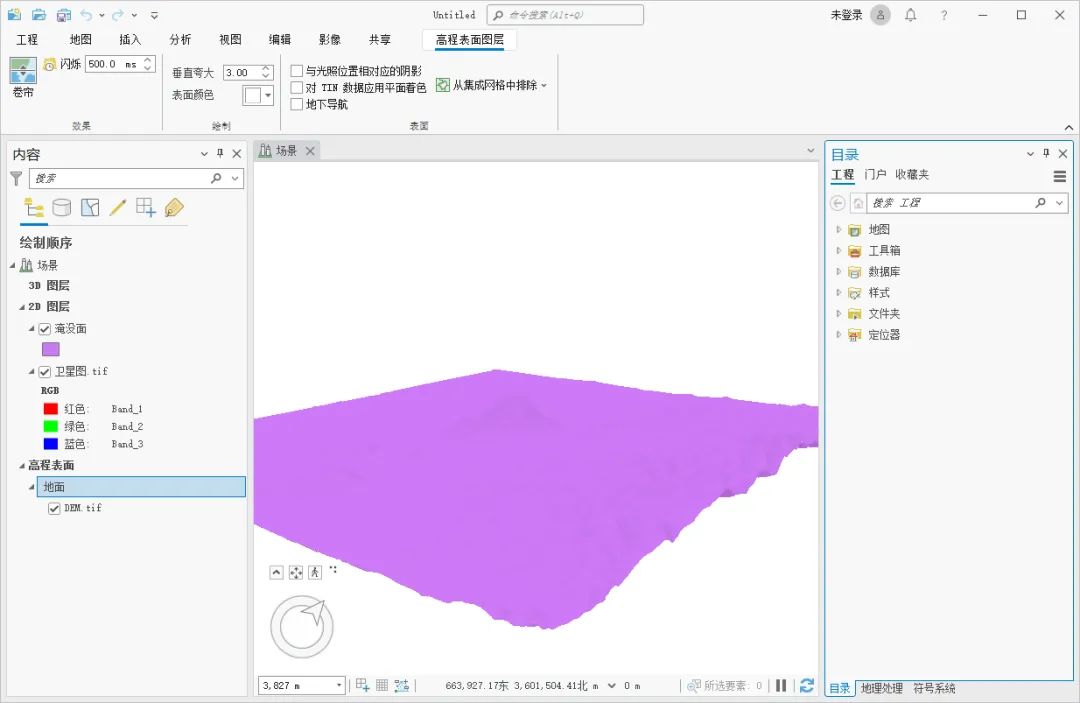 加载后我们可以看到地形起伏效果并不是那么明显,所以我们可以调整一下垂直夸大因子,左侧图层内选中地面,菜单栏上选择高程表面图层,垂直夸大设置为3,如下图所示。