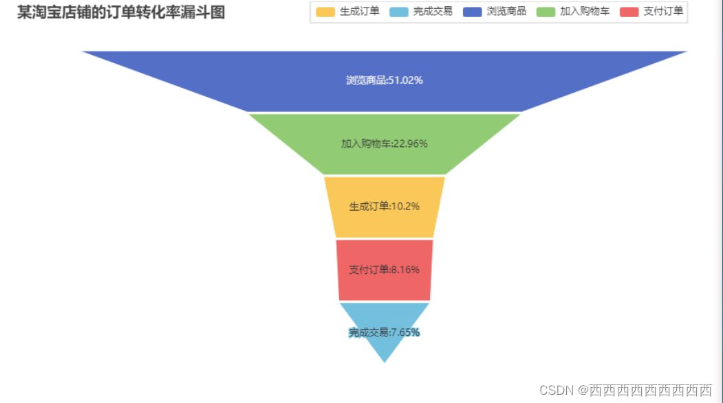 # 代码5-41from pyecharts.charts import Funneldata = pd.read_excel('E:/xsy/python数据分析/data/某淘宝店铺的订单转化率统计数据.xlsx')x_data = data['网购环节'].tolist()y_data = data['人数'].tolist()data = [[x_data[i], y_data[i]] for i in range(len(x_data))]funnel = (Funnel().add('', data_pair=data,label_opts=opts. LabelOpts(position='inside', formatter='{b}:{d}%'), gap=2,tooltip_opts=opts.TooltipOpts(trigger='item'),itemstyle_opts=opts.ItemStyleOpts(border_color='#fff', border_width=1)).set_global_opts(title_opts=opts.TitleOpts(title='某淘宝店铺的订单转化率漏斗图'),legend_opts=opts.LegendOpts(pos_left='40%')))funnel.render_notebook()