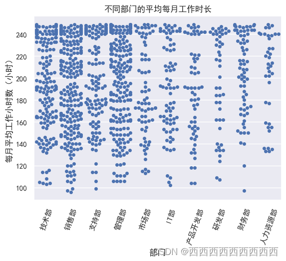 sns.swarmplot(x='部门',y='每月平均工作小时数(小时)',data=hr2)