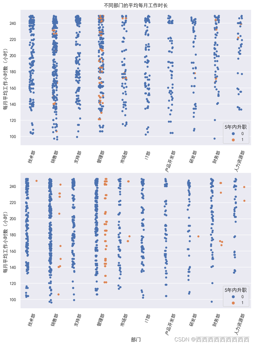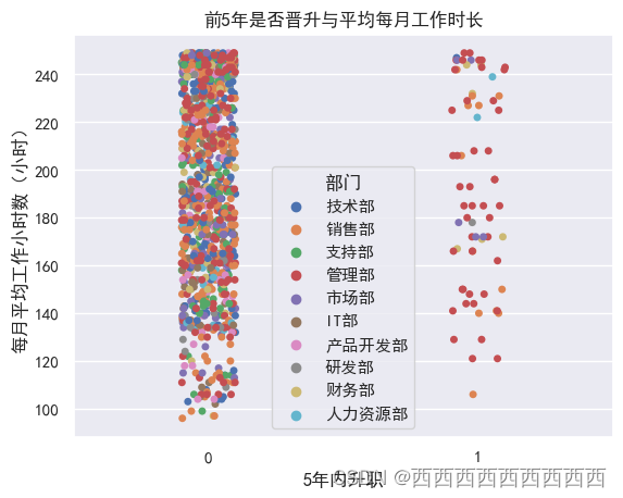 sns.stripplot(x='5年内升职',y='每月平均工作小时数(小时)',hue='部门',data=hr2,jitter=True) #以部门作为颜色分类