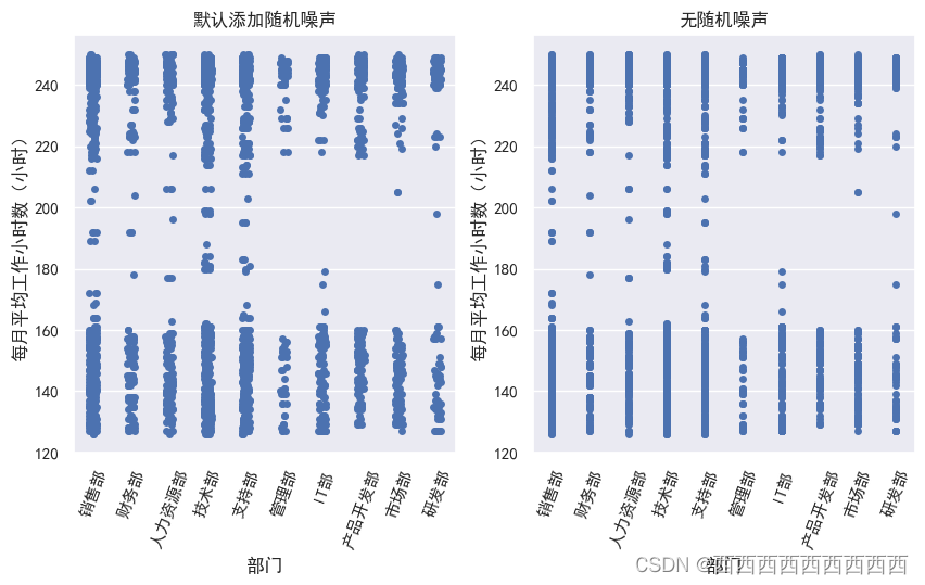 sns.stripplot(x='部门',y='每月平均工作小时数(小时)',data=hr1) #默认添加随机噪声