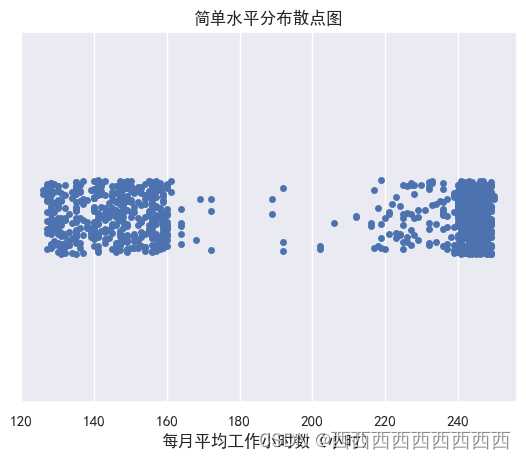 sns.stripplot(x = sale['每月平均工作小时数(小时)'])