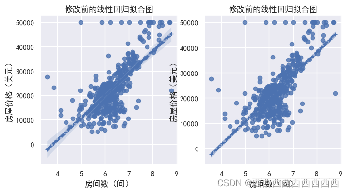 sns.regplot(x='房间数(间)',y='房屋价格(美元)',data=boston,ci=50,ax=axes[1])