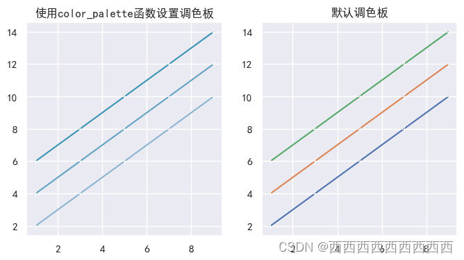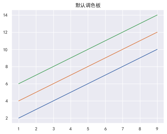 x = np.arange(1,10,2)y1 = x + 1y2 = x + 3y3 = x + 5def showLine(flip=1):sns.lineplot(x=x,y=y1)sns.lineplot(x=x,y=y2)sns.lineplot(x=x,y=y3)# 使用默认调色板showLine()plt.title('默认调色板')plt.show()