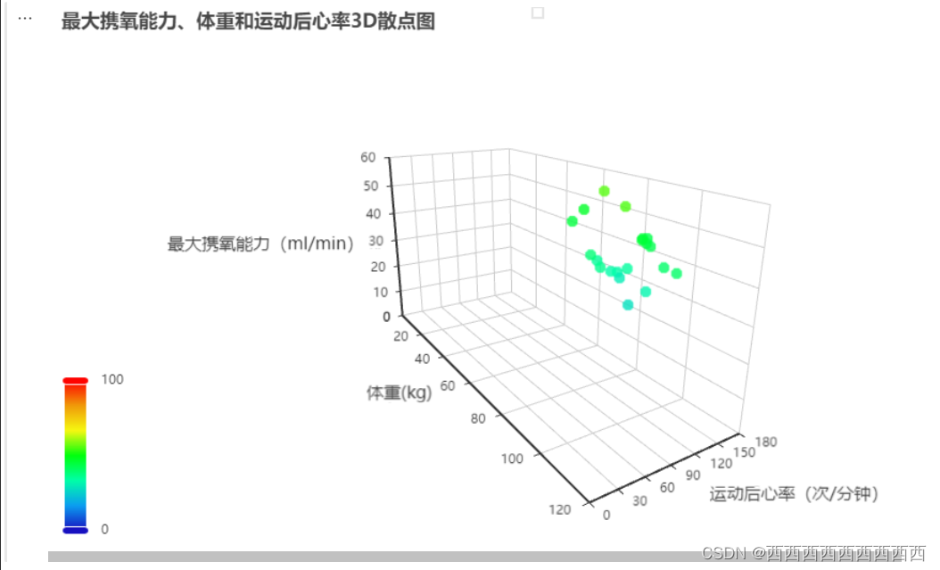 s = (Scatter3D().add('', player_data, xaxis3d_opts=opts.Axis3DOpts(name='体重(kg)'), yaxis3d_opts=opts.Axis3DOpts(name='运动后心率(次/分钟)'), zaxis3d_opts=opts.Axis3DOpts(name='最大携氧能力(ml/min)')).set_global_opts(title_opts=opts.TitleOpts(title='最大携氧能力、体重和运动后心率3D散点图'), visualmap_opts=opts.VisualMapOpts(range_color=['#1710c0', '#0b9df0', '#00fea8', '#00ff0d', '#f5f811', '#f09a09', '#fe0300'])))