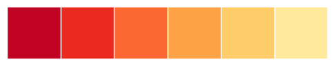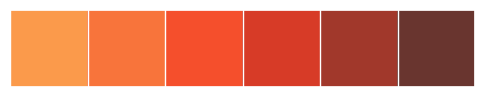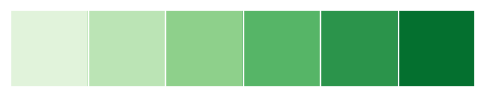 sns.palplot(sns.color_palette('Greens'))sns.palplot(sns.color_palette('YlOrRd_r'))sns.palplot(sns.color_palette('YlOrRd_d'))