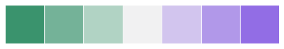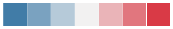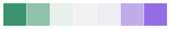 sns.palplot(sns.diverging_palette(240,10,n=7))sns.palplot(sns.diverging_palette(150,275,s=80,l=55,n=7))# 创建中间是暗色的调色板sns.palplot(sns.diverging_palette(250,15,s=75,l=40,n=7,center='dark'))# 通过sep参数控制中间区域渐变宽度sns.palplot(sns.diverging_palette(150,275,s=80,l=55,n=7,sep=80))