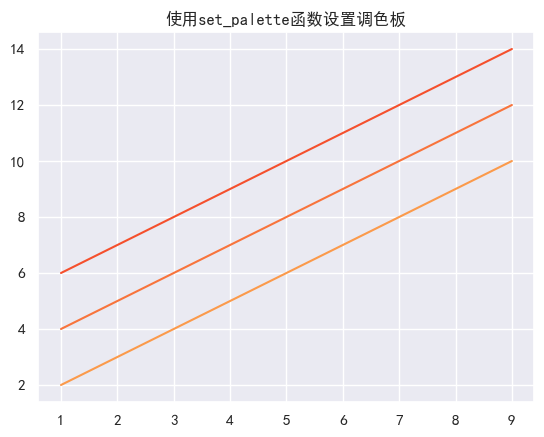 sns.set_palette('YlOrRd_d')showLine()plt.title('使用set_palette函数设置调色板')plt.show()