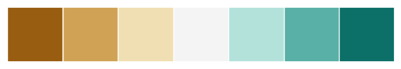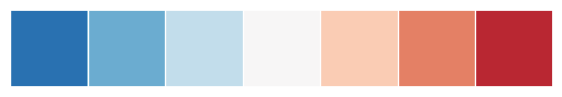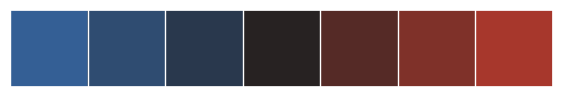 sns.palplot(sns.color_palette('BrBG',7))sns.palplot(sns.color_palette('RdBu_r',7))