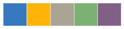 #自定义定性调色板colors = ['windows blue','amber','greyish','faded green','dusty purple']sns.palplot(sns.xkcd_palette(colors))