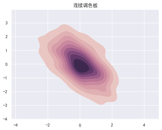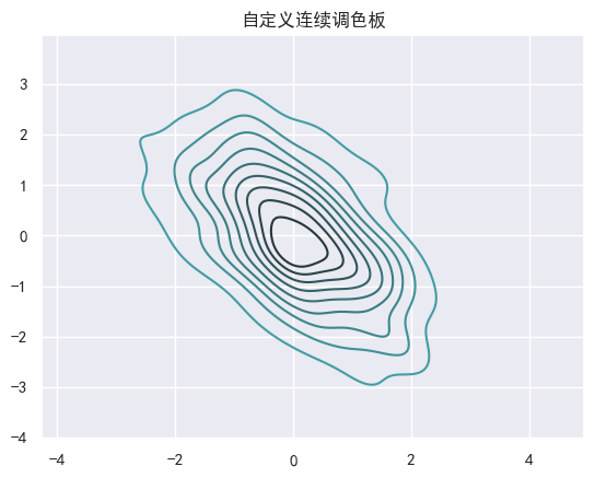 # 使用HUSH颜色作为种子pal = sns.dark_palette((200,80,60),input='husl',reverse=True,as_cmap=True)sns.kdeplot(x=x,y=y,cmap=pal)plt.title('自定义连续调色板')plt.show()