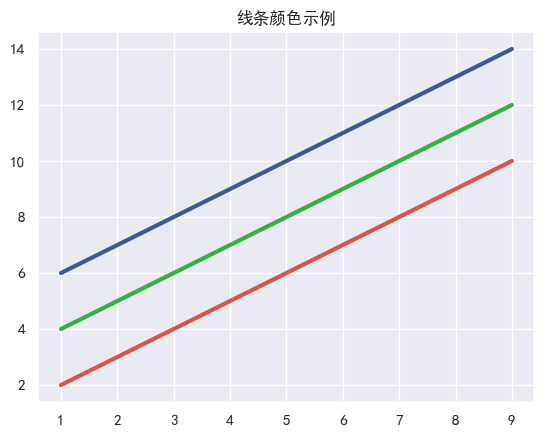 plt.rcParams['font.sans-serif'] = ['SimHei']plt.plot(x,y1,sns.xkcd_rgb['pale red'],lw=3)plt.plot(x,y2,sns.xkcd_rgb['medium green'],lw=3)plt.plot(x,y3,sns.xkcd_rgb['denim blue'],lw=3)plt.title('线条颜色示例')plt.show()