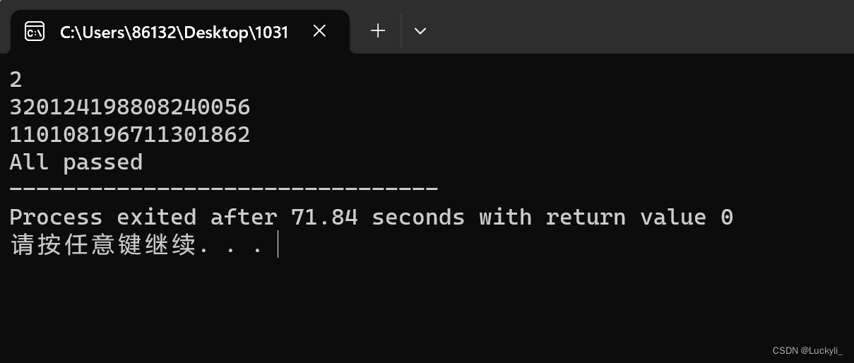 按照输入的顺序每行输出1个有问题的身份证号码。这里并不检验前17位是否合理,只检查前17位是否全为数字且最后1位校验码计算准确。如果所有号码都正常,则输出All passed。