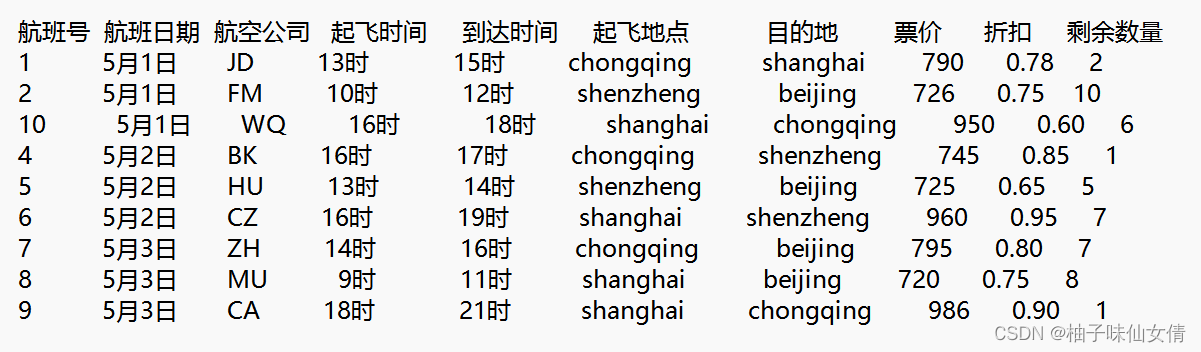 (6)提供各种查询功能:例如按起飞(抵达)城市查询、按航空公司查询、按票价折扣查询等。