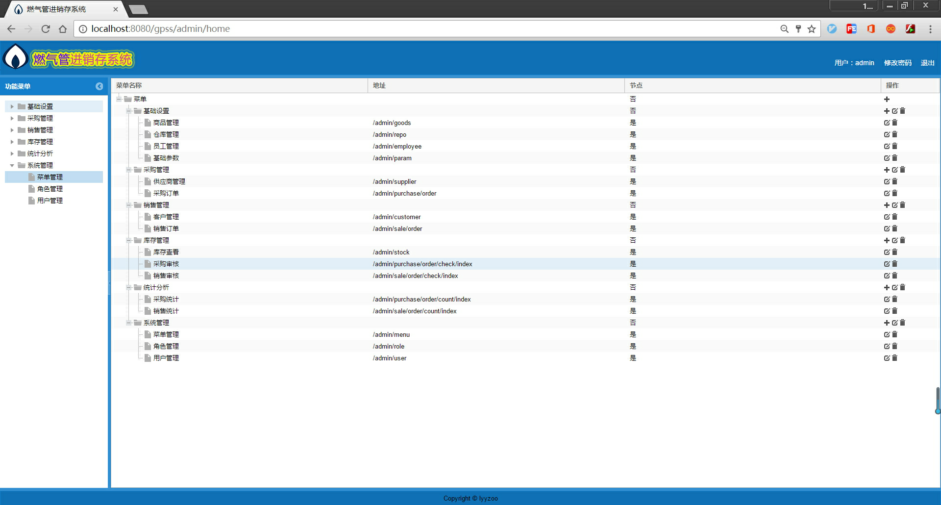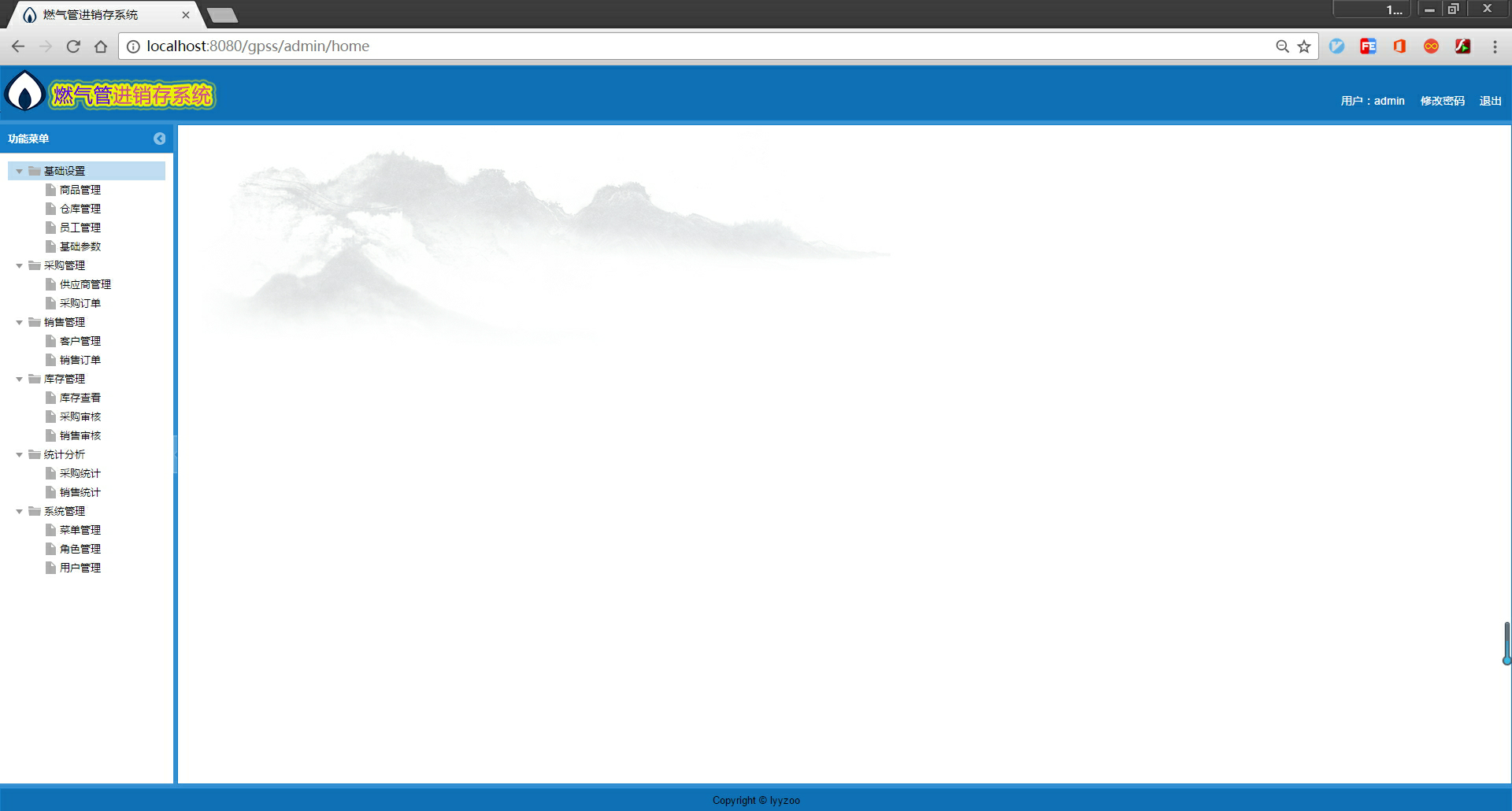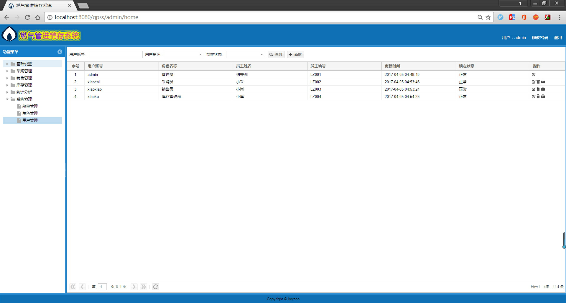 系统分为 6 大模块,分别是基础设置、采购管理、销售管理、库存管理、统计分析、系统管理。系统设置的角色有 admin、采购员、销售员、库存管理员等。